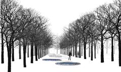 Suunnitelmassa puisto on jaettu selkeästi pohjoisen tilakeskuksen ympäristöön ja eteläiseen moderniin puistonosaan. Niiden saumakohdassa eri suuntaisten koordinaatistojen kohtauspaikassa polveilee keskeinen poikittaisen liikenteen väylä puiston läpi. Sen varrelle muodostuu aukioita, joihin voidaan pysähtyä oleskelemaan ja istumaan. Niillä voidaan myös järjestää erilaisia tapahtumia.