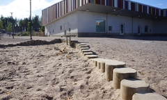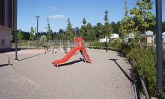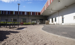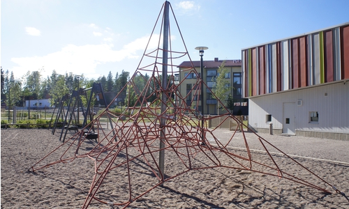 Leikki- ja huoltopihat on erotettu toisistaan rakennuksen eri puolille, jolloin leikkipiha aukeaa etelään ja huoltopiha