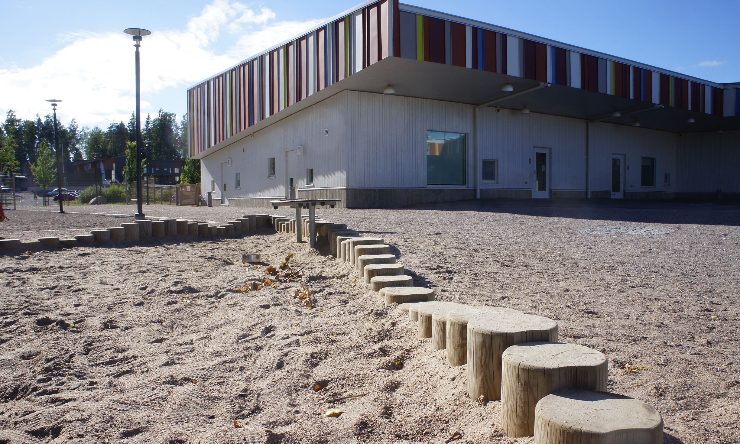 Päiväkoti on kuuden lapsiryhmän kokonaisuus Espoon Lintuvaarassa. Kulmikas U-muotoinen rakennus jakaa pihatoimintoja.